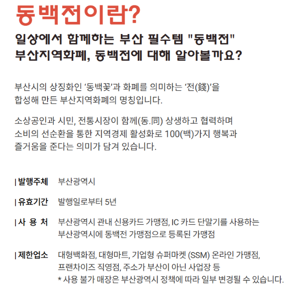 A. 부산시 동백전 가맹점에서 자유롭게 사용 가능합니다. 일부 제휴 온라인몰도 포함됩니다.