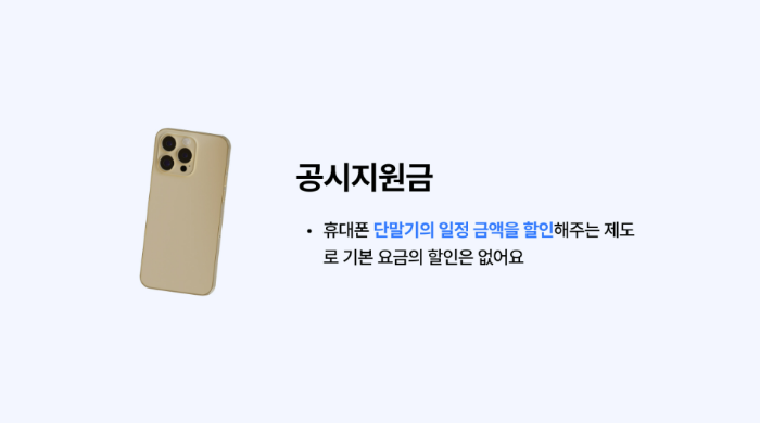 공시지원금은 통신사와 제조사가 소비자에게 단말기 가격의 일부를 공식적으로 할인해주는 제도입니다.'이통사 홈페이지 또는 스마트초이스'를 통해 공개된 금액을 기준으로 하며, 동일 단말기라도 통신사/요금제/가입유형에 따라 지원금이 달라집니다.