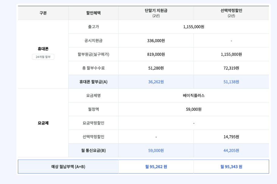 | 추천 상황 | 고가 단말기 + 저가 요금제 | 고가 요금제 사용 시 |
