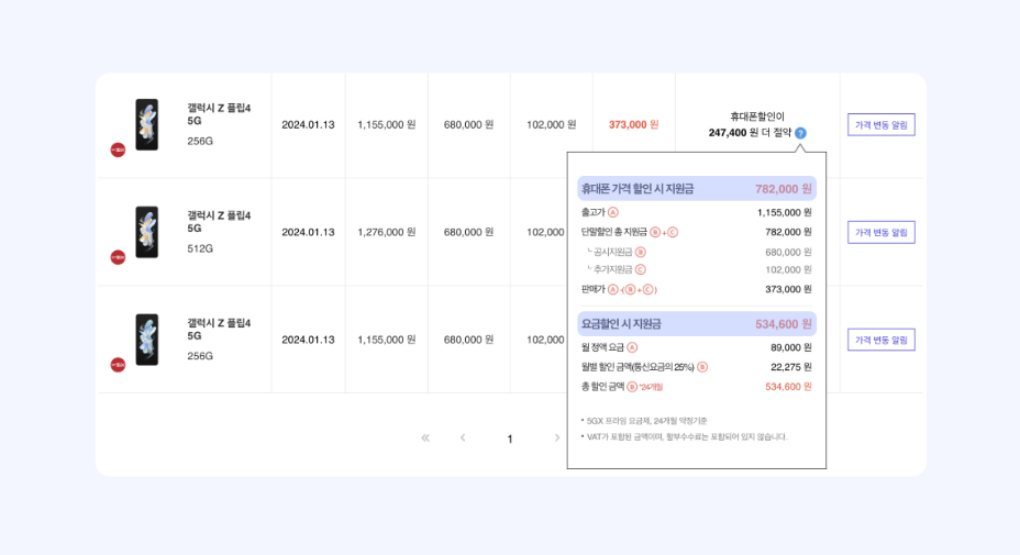 ※ [공식 기준] 공시지원금은 방송통신위원회가 정한 '이동전화 단말기 유통구조 개선에 관한 법률(단통법)'에 따라 15일 이내 변경될 수 있고, 지원금 외 추가지원금은 최대 15%까지 가능해요.